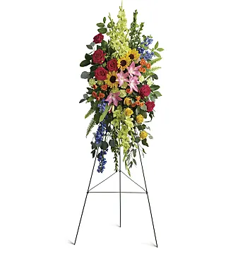 A bold, bright tribute, this rainbow of blooms fills the room with a spirit of hope and joy. What a glorious celebration of a love that will live on forever.