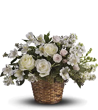 Send comfort and thoughts of hope for a brighter day with this peaceful basket of white sympathy blooms, and a sweet hint of pink. Gently uplifting, it is perfect for the service.
