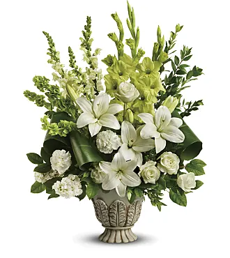 As serene as gently falling snow, this elegant white arrangement in a large antiqued pot is a heartfelt symbol of peace and beauty, a memory that will remain a guiding light to your loved ones for years to come.