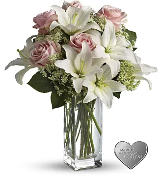 Stunning in its simplicity, this innocent harmony of light pink roses and snow white lilies are a heartfelt way to send your very best. The classic, clear rectangular glass vase keeps the focus on the heavenly beauty of the blooms.
