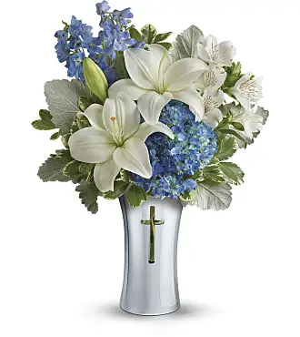 An elegant expression of your deepest condolences, this majestic mix of blue hydrangea and white lilies will refresh and rejuvenate their spirits. It’s hand-delivered in a shining, silver-finished ceramic vase with cross cut-out – a serene, spiritual keepsake they’ll always treasure.