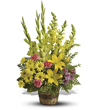Send sunshine to show you care. A symbol of friendship, these yellow sympathy flowers are accented with pretty pink carnations for a classic sympathy basket that will warm anyone’s heart.